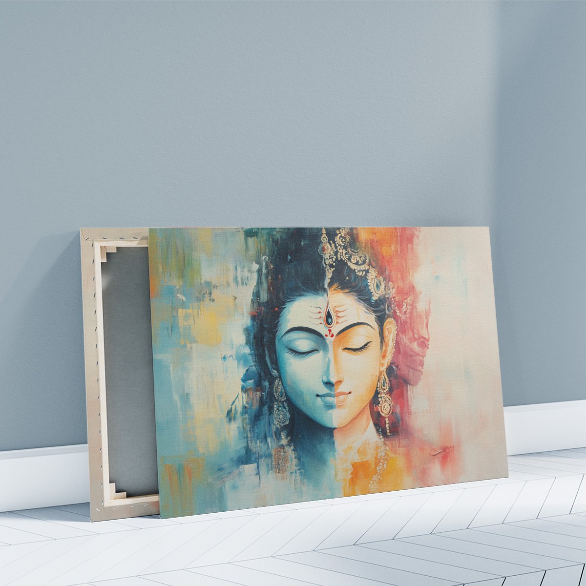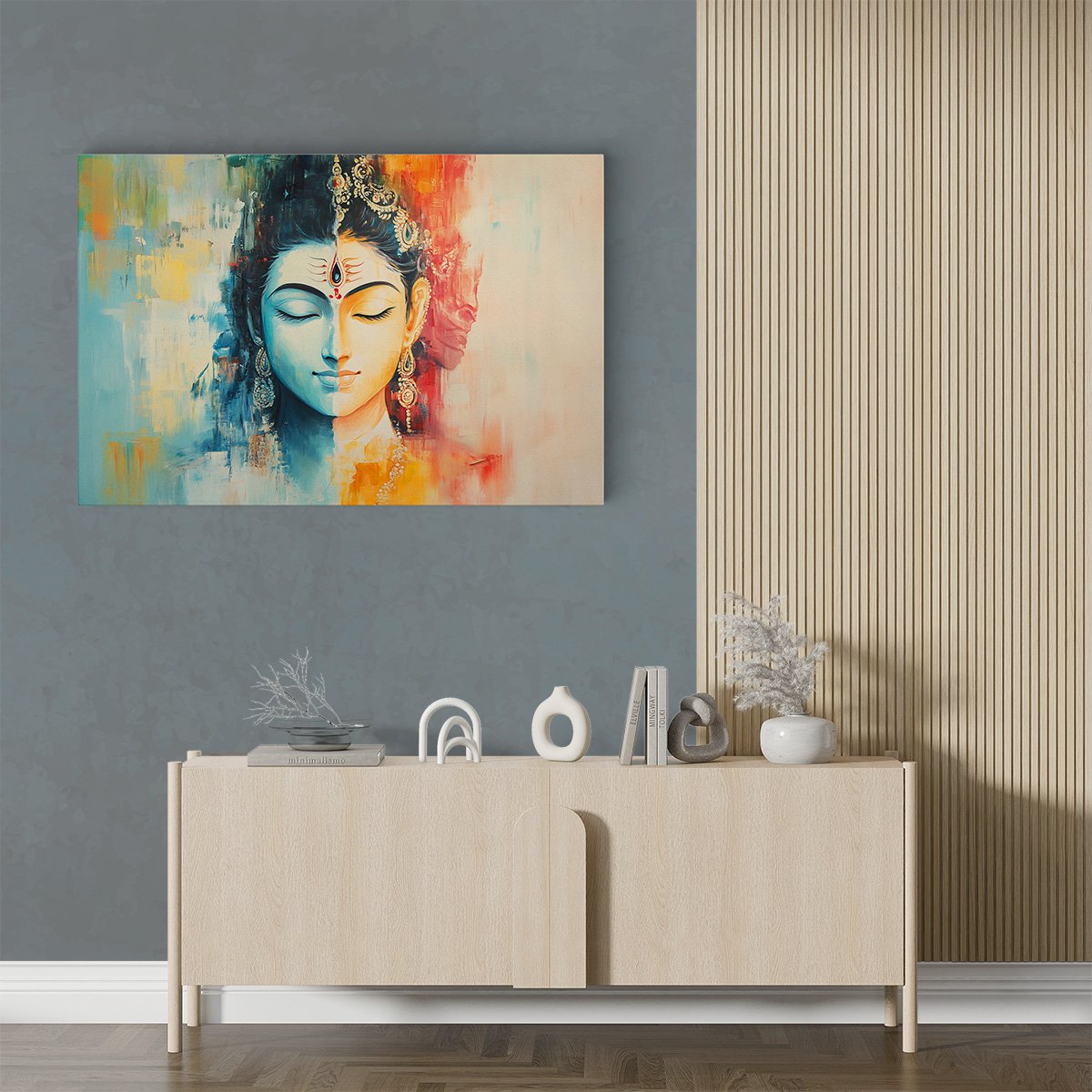 Embrace the spiritual harmony of Shiva and Shakti with this captivating Ardhanarishvara canvas. This artwork beautifully merges the divine masculine (Lord Shiva) and feminine (Goddess Parvati) into a single entity, representing cosmic balance and unity. The striking use of warm and cool tones, along with an abstract brushstroke effect, creates a contemporary yet deeply spiritual aesthetic.