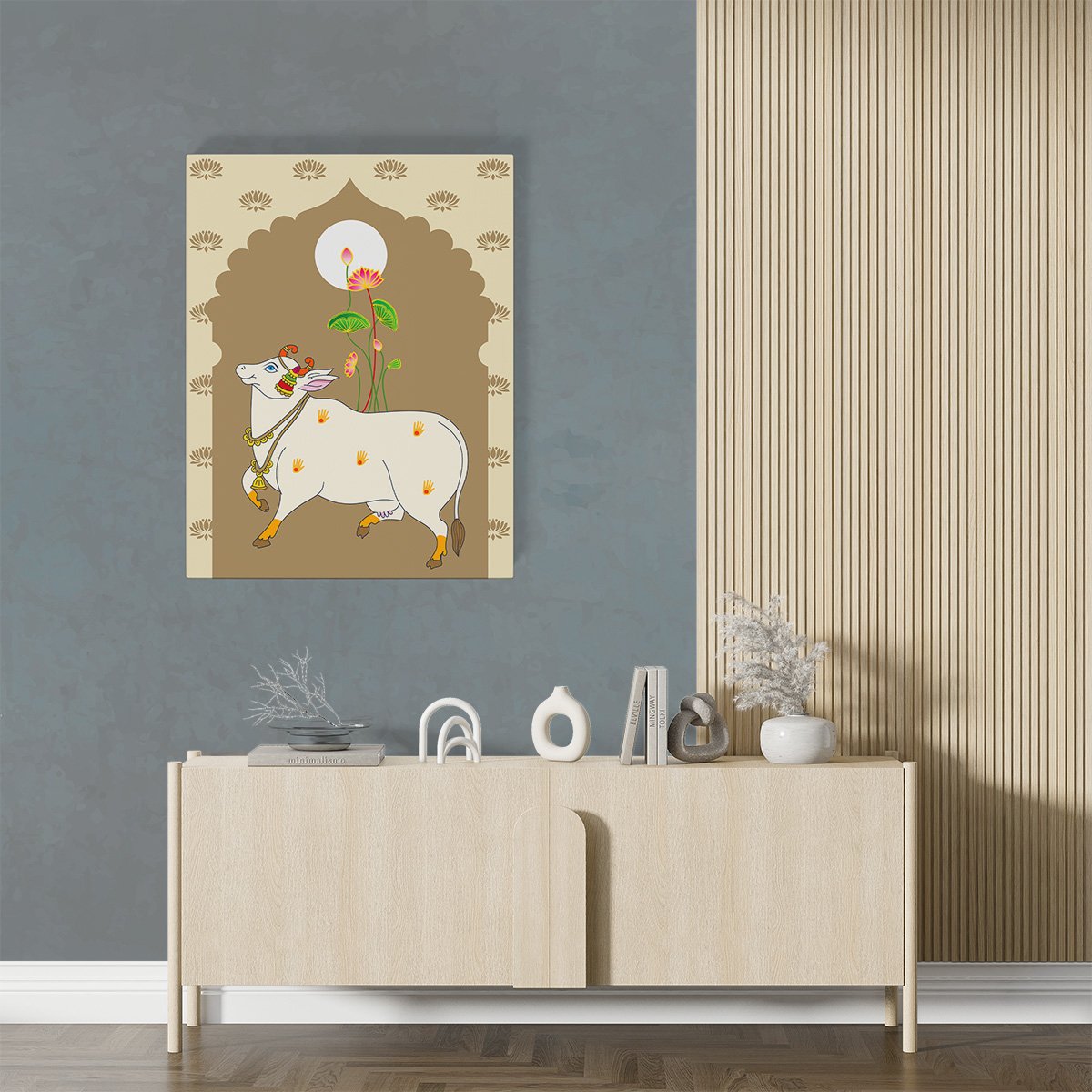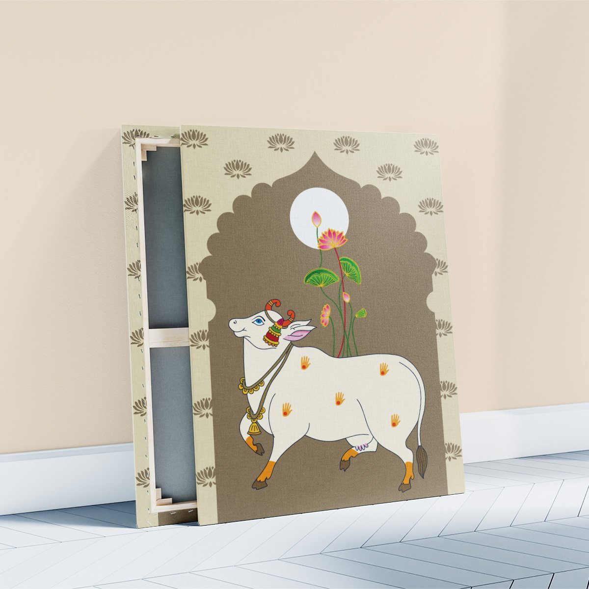 Transform your walls with the exquisite charm of Ethnic Pichwai Art Cow Canvas Wall Prints, inspired by the centuries-old Rajasthani art form. Pichwai paintings, known for their intricate detailing and vibrant colors, depict divine themes, primarily focusing on sacred cows and spiritual symbolism. This canvas print captures the essence of Indian heritage, making it a perfect addition to living rooms, puja rooms, offices, or art galleries.
