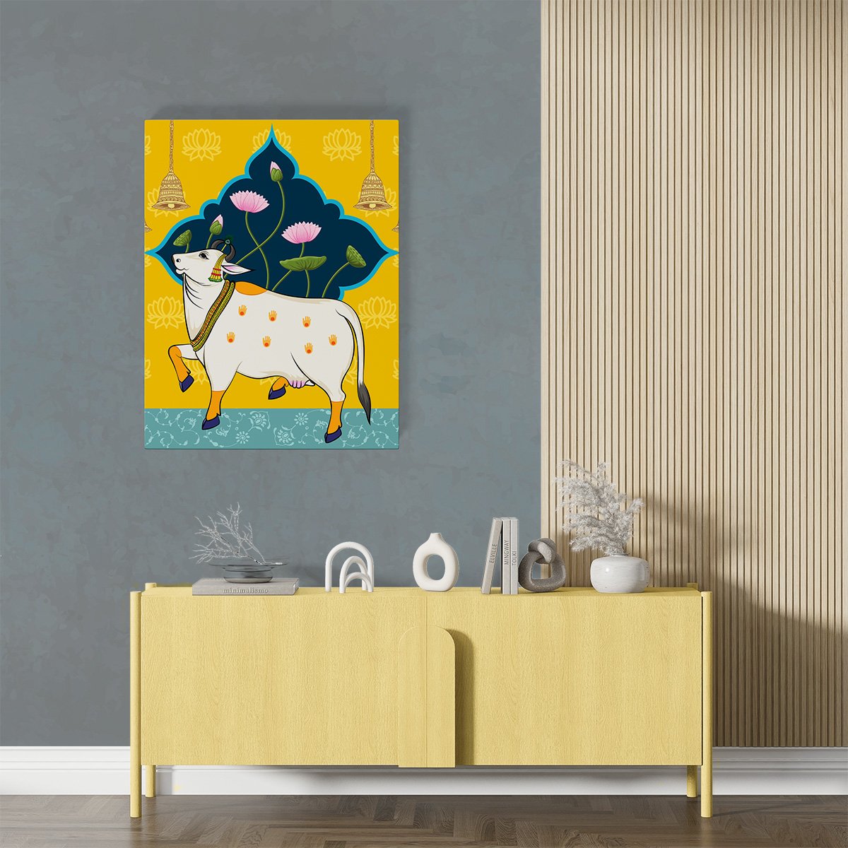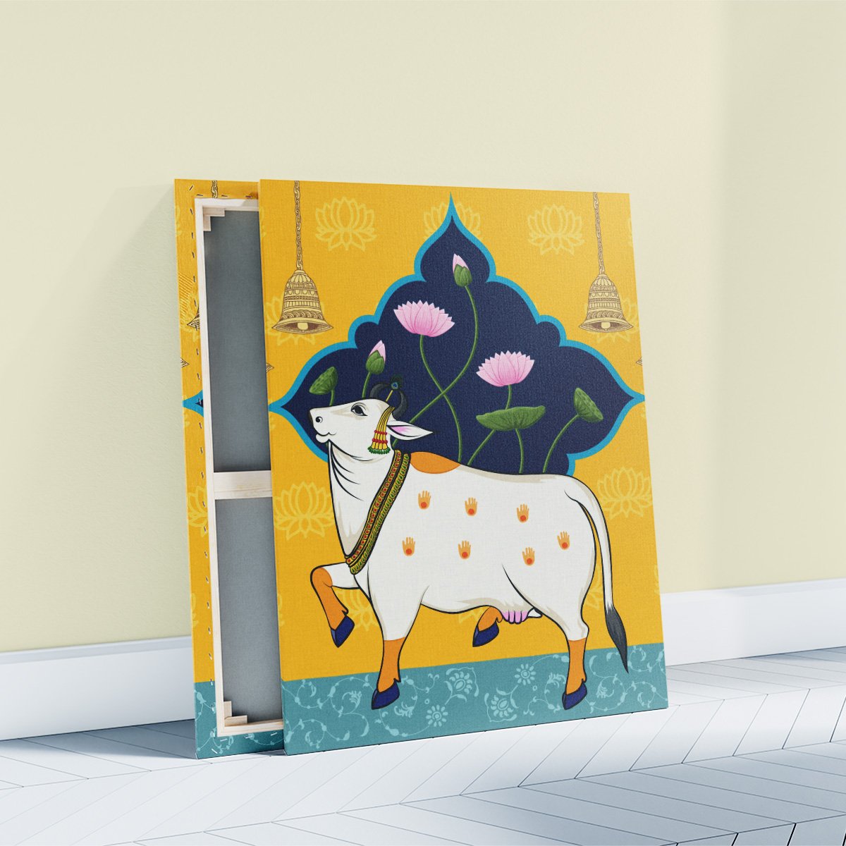 Celebrate the rich heritage of Indian devotional art with Sacred Harmony – Divine Cow & Lotus Rajasthani Pichwai Canvas Wall Art. Inspired by the traditional Pichwai paintings of Rajasthan, this artwork depicts sacred cows, symbols of prosperity and divinity, gracefully set against a backdrop of serene lotus blooms.